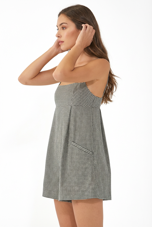 Plaid Square Neck Babydoll Romper with Pockets Women