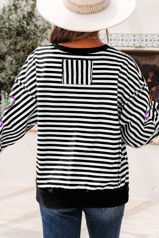 Black Stripe Raw Seam Detail Sequin Mardi Gras Heart Patched Graphic Long Sleeve Top