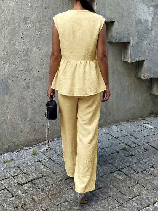 Faux Linen Peplum Vest Wide Leg Pants Matching Set