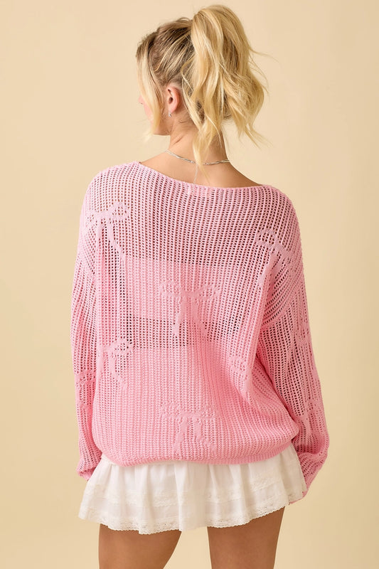 Lightweight Crochet Knit Boat Neck Sweater Top Pink