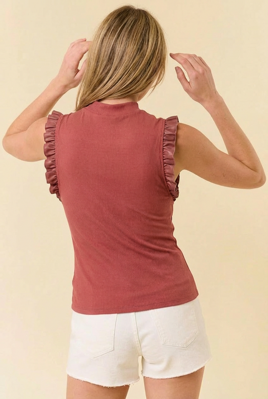 Ribbed Mock Neck Ruffle Sleeve Fitted Tank Top