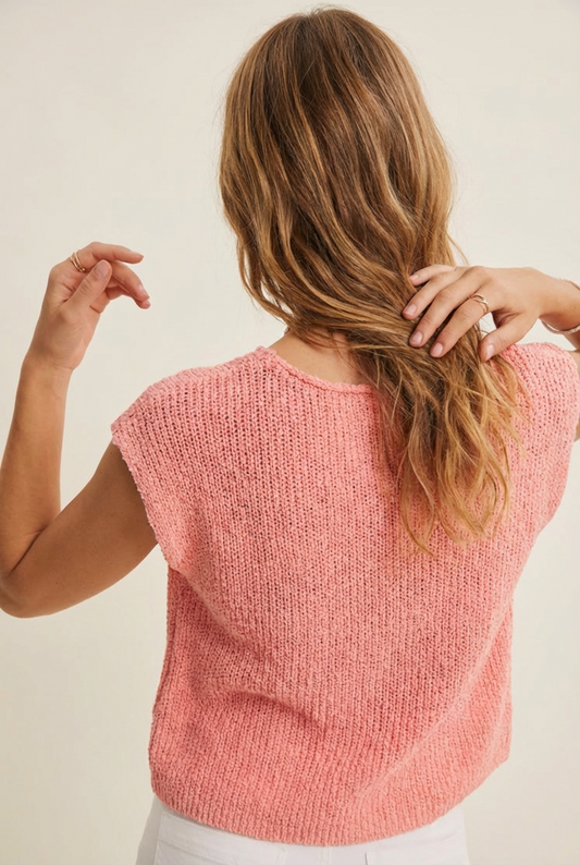 Slub Knit Split Neck Relaxed Short Sleeve Sweater Top