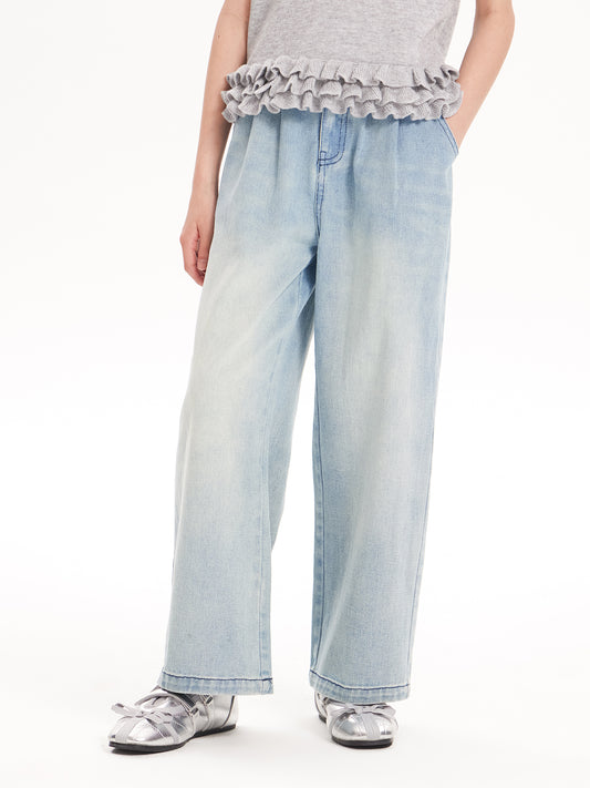 2025 Spring Girls Washed Straight Leg Denim Jeans | Solid Color Long Pants