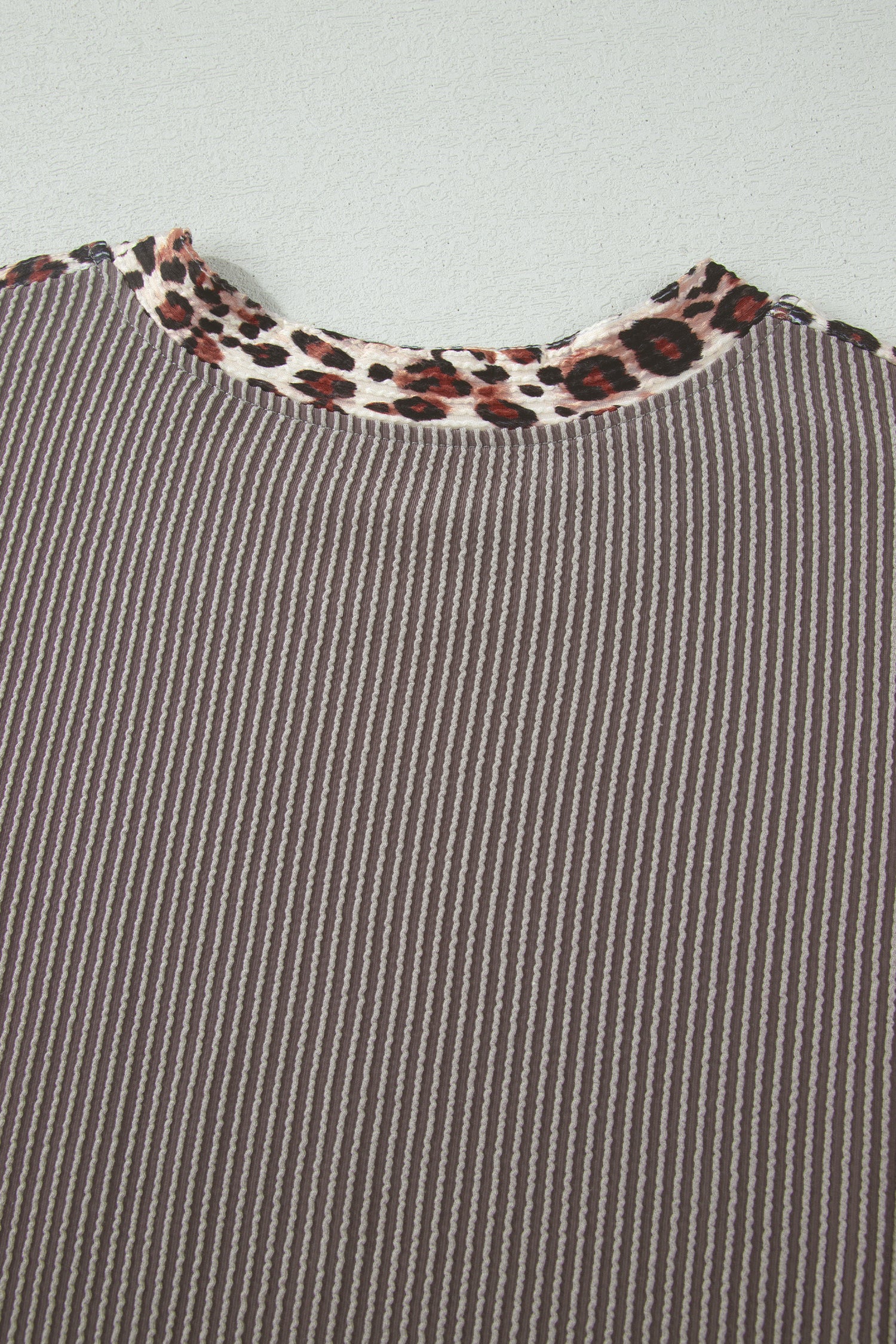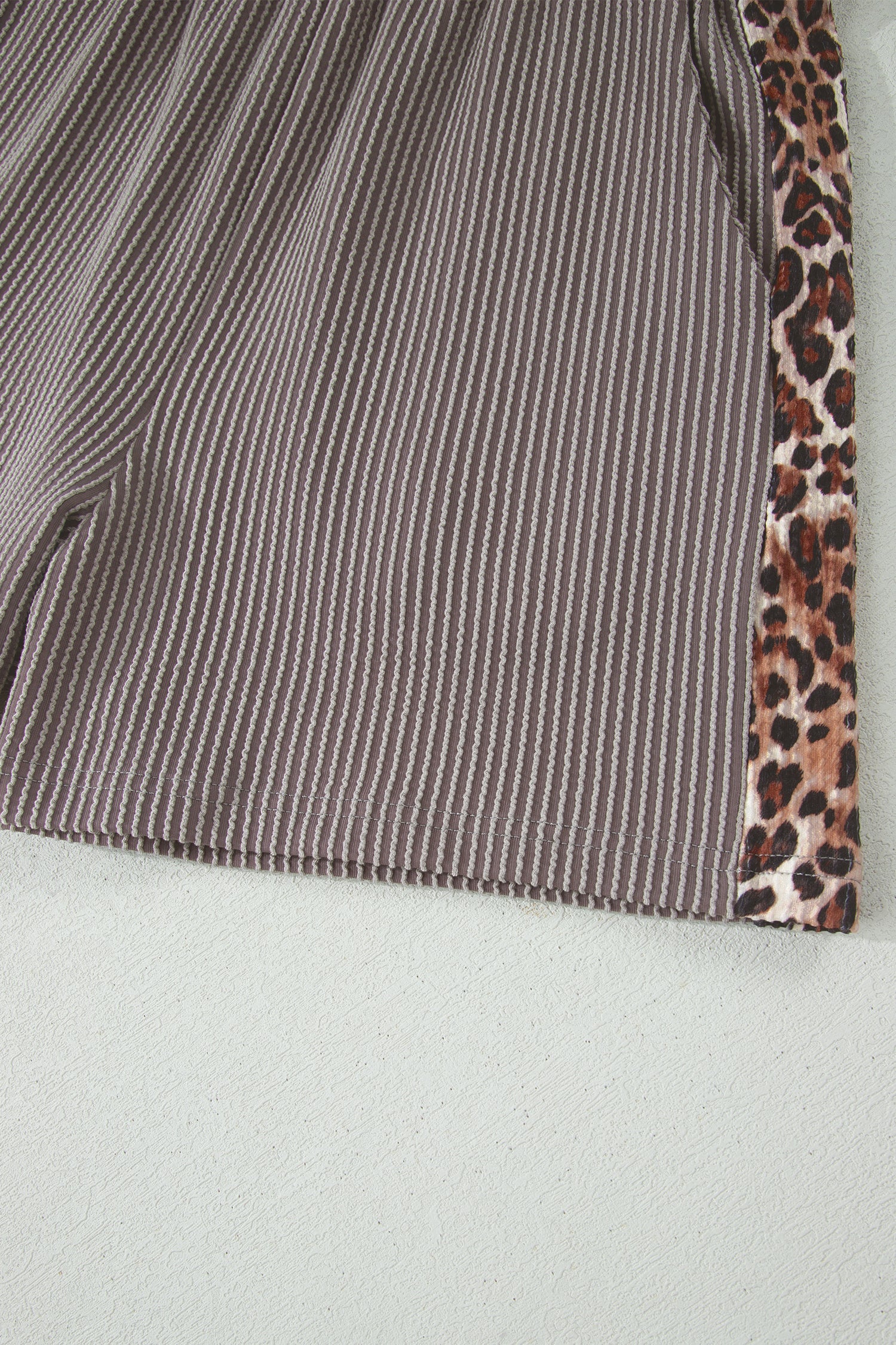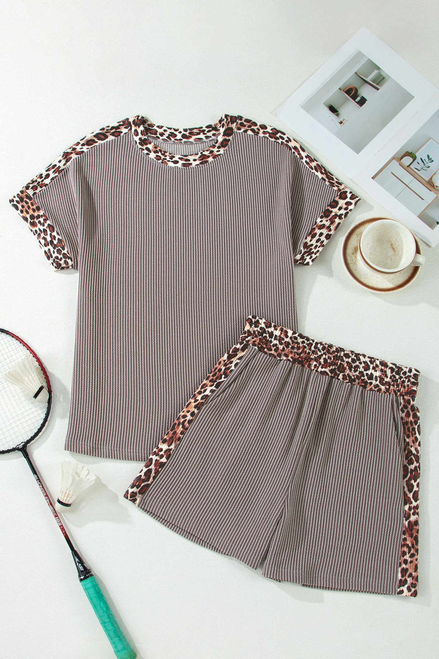 Leopard Trim Ribbed Short Sleeve Top and Shorts Set
