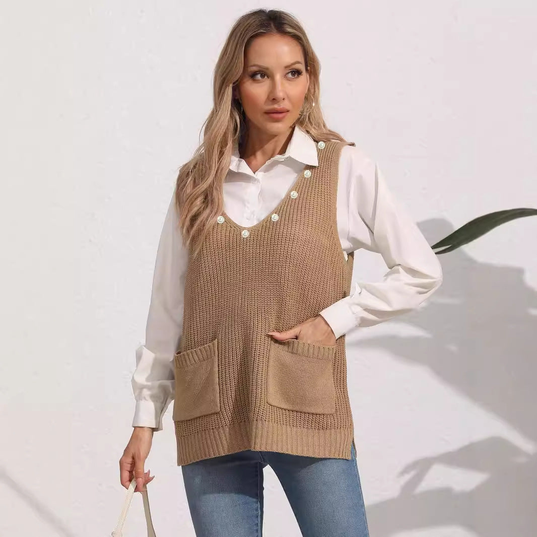 Women's Vest Double Pocket Splicing V-Neck Casual Pearl Vest Sweater